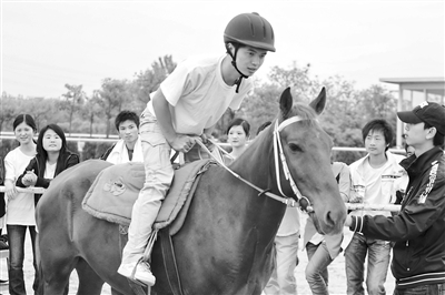 “挑选骑师,对身高、体重有严格要求。”武汉商业服务公司体育系主任夏云建说,男女生身高分别要在165厘米和158厘米以下,体重分别不超过50公斤和48公斤;跑步、跳高、仰卧起坐等项目也必须达标。因为个子长得太高,3名学员被淘汰了。