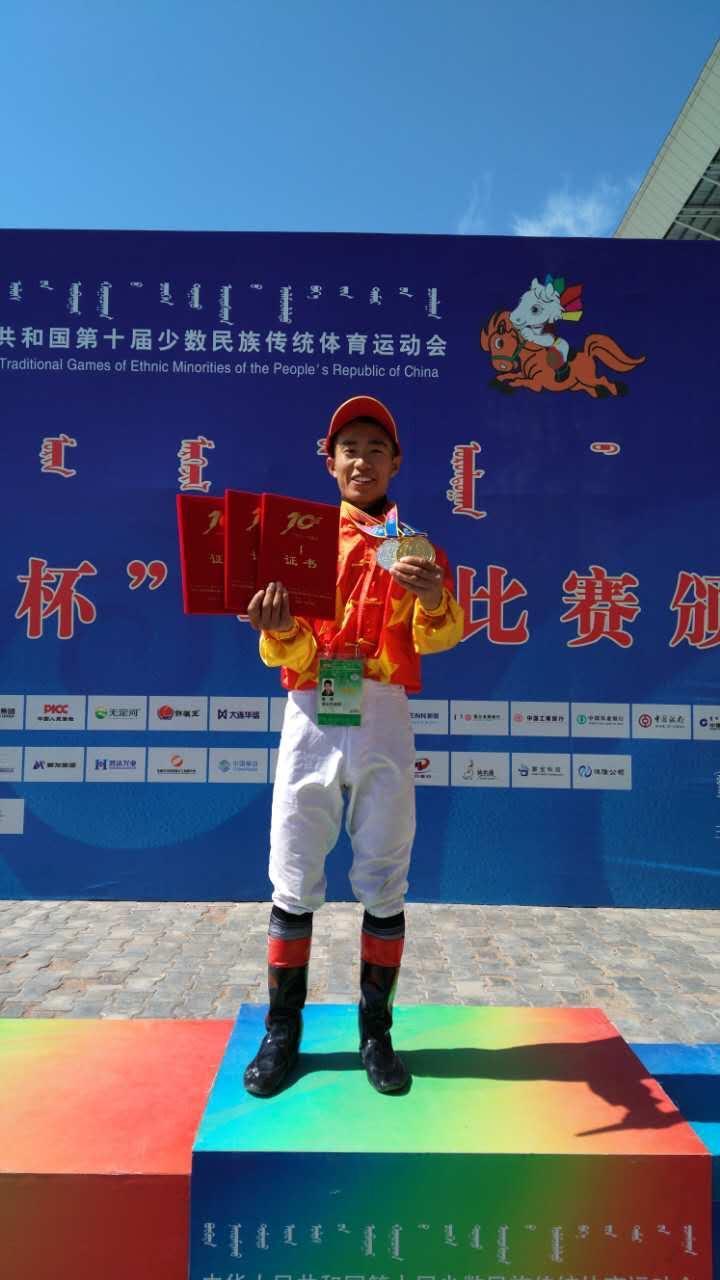 8月12日,内蒙古鄂尔多斯,第十届全国少数民族传统体育运动会2000米速度赛马比赛,bv伟德国际19462011届毕业生覃勇策骑战驹“圆满”奋蹄疾弛,以领先第二名10个马位的显著优势,勇夺冠军。