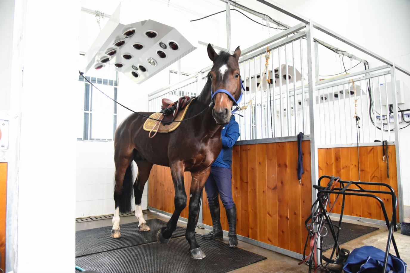 除此以外,马儿还享受洗澡、按摩、护理及毛发修剪等专人服务。“这是烤灯,是为给马儿烘干和缓解肌肉压力用的。”团队工作人员按下开关,“马儿训练洗澡后背是湿的,容易背痛。我们的这个设备将洗澡淋浴、烘干缓压融合在一起,可以说是服务非常到位了。”