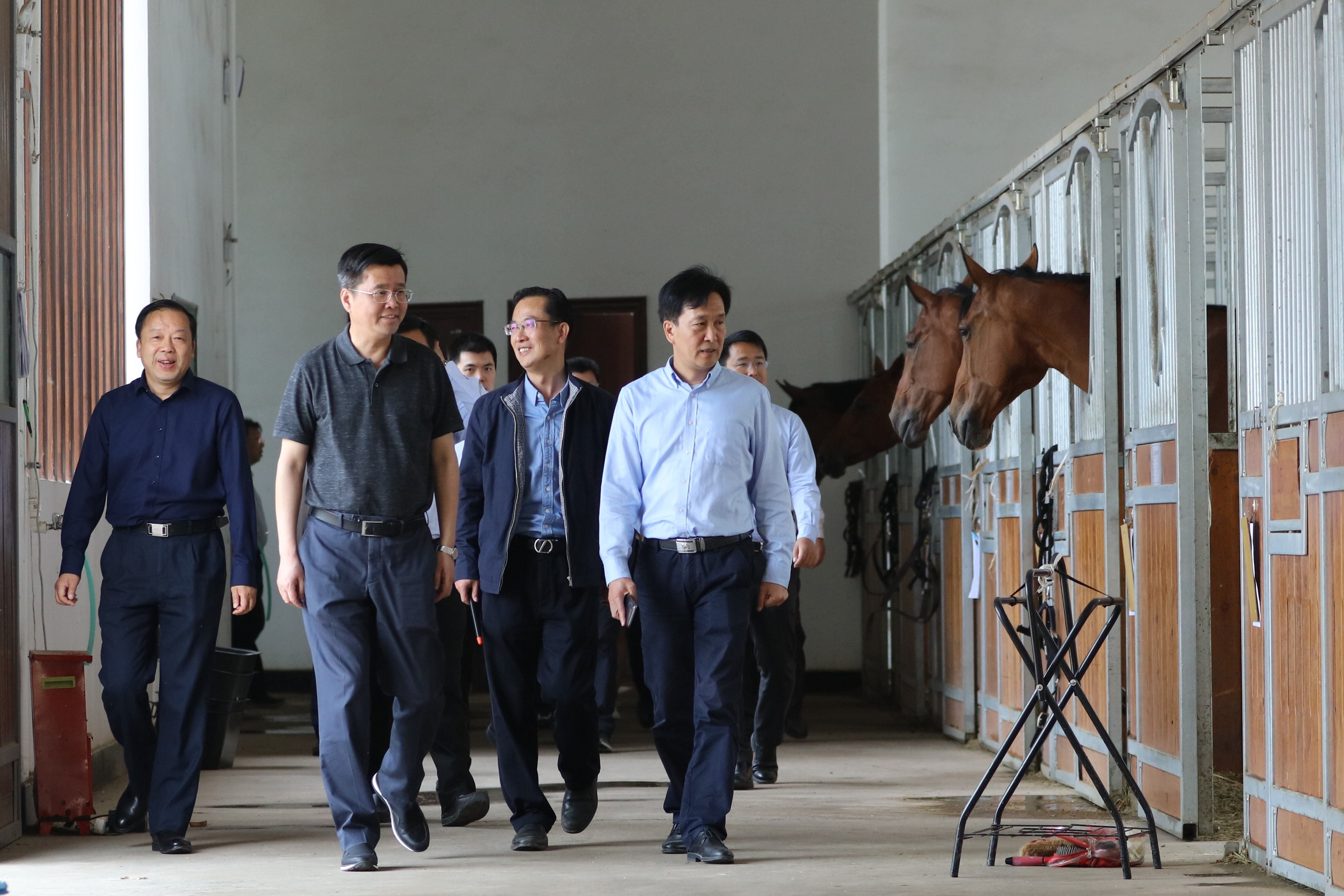 陈邂馨一行先来到公司体育馆,王清华为其介绍了体育馆的整体改造情况、功能布局及智能化系统。陈邂馨步入改造后用于击剑项目的场地,实地查看改造情况,并了解场馆验收后目前的维护工作。在游泳馆中,孙步月为陈邂馨介绍了新建游泳馆中的“黑科技”,仿水波纹幕墙系统、仿装饰空间吸声系统到全天候恒温游泳池,陈邂馨在听完介绍后,还仔细询问相关配套设施是否完善。在驭马体育公园中,张石在马房里向陈邂馨介绍军运会比赛用马的基本情况,并向陈邂馨展示公司在近期新搭建的标准化临时马房。陈邂馨一行还前往马术障碍赛场地,查看马匹训练及场地铺设情况。