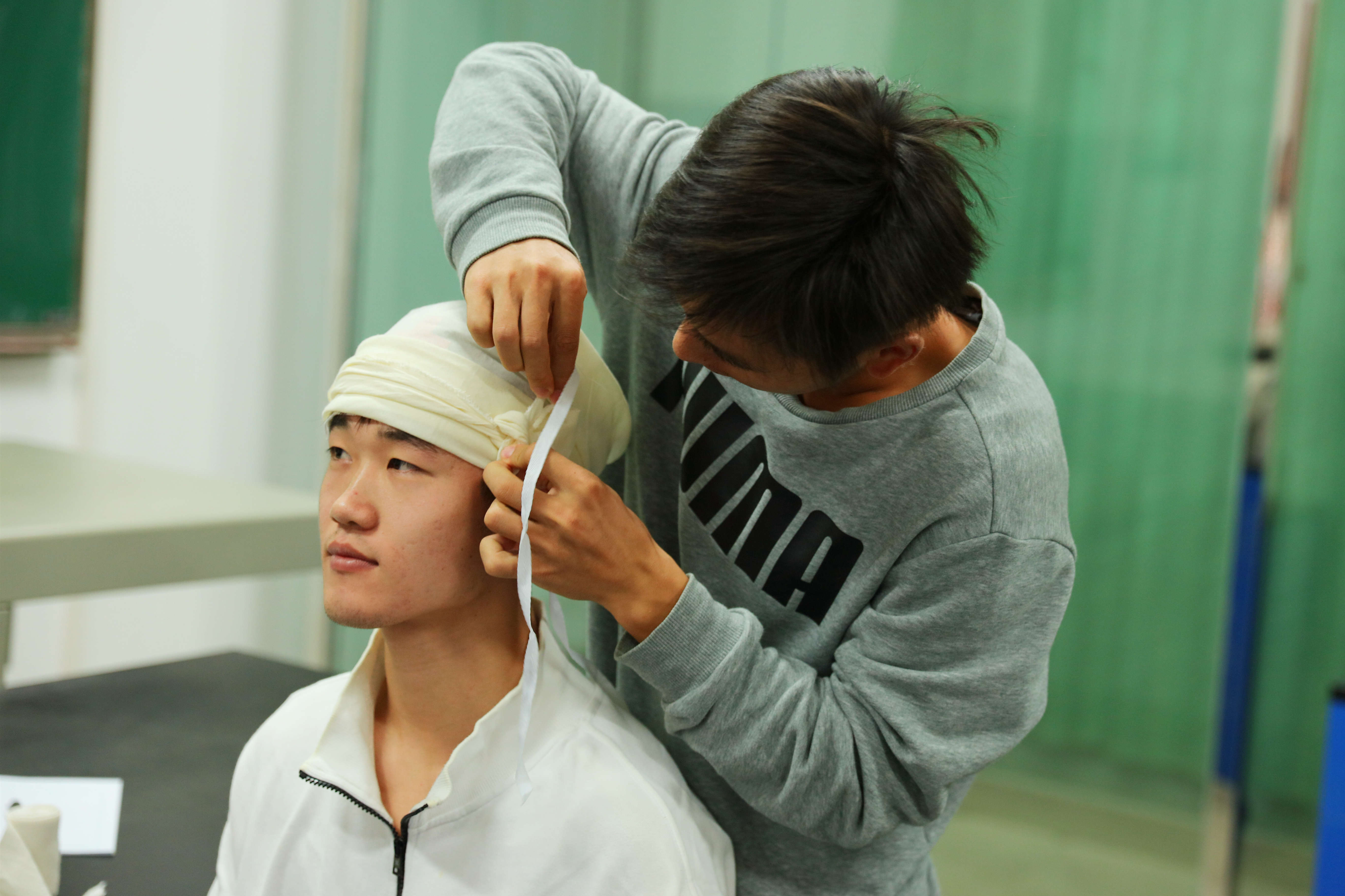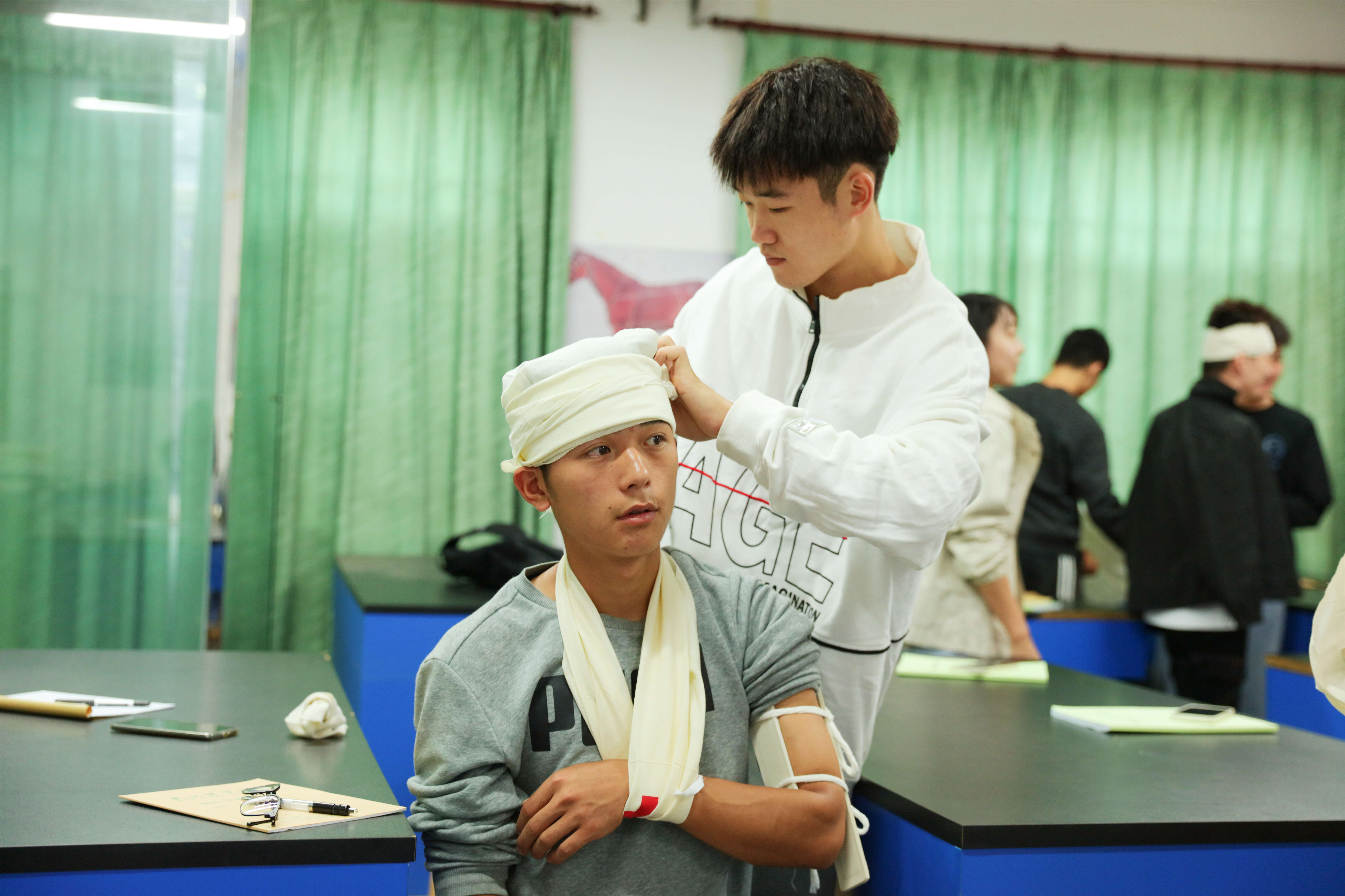 在2019级休闲体育专业的课堂上,伟德bv1946官网教师王峰正在演示肱骨干骨折的临时固定方法,“取两块合适的夹板,分别置于伤残外肢和内侧,用叠成带状的三角巾在骨折的上下两端将夹板固定。”言语之间,王峰已经包扎出一个完整的固定支架。接着,王峰分别演示了前臂骨折固定法、“8”字形包扎法、螺旋形包扎法等多种基础急救固定方法。“伤者”的扮演者田茂素在王峰的手中已是“伤痕累累”,成了同学们实操的模板,大家两人一组,领取所需的绷带和夹板,根据老师展示的固定方法分别为对方进行相应位置的包扎固定。一节课下来,同学们身上已缠满了绷带,大家纷纷合照留念,记录这“特别”的一幕。