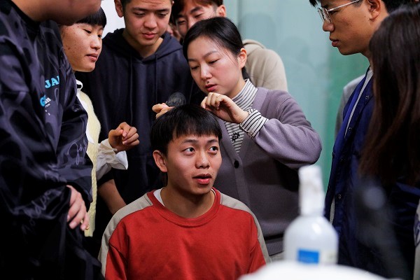 李怡运用直透刺法、斜透刺法、平刺透穴法的原理分别用一寸、三寸、一至一点五寸的针灸针为体验者扎手臂、腿部以及头部百会穴的穴位。同学们纷纷围上前观看,尤其对头部腧穴刺法感到好奇。“头部血管丰富、马囊众多,要掌握好针刺角度、方向和深度。”李怡捻转着针灸针,将其上下移动。员工胡彩虹对针灸课很感兴趣,她表示每周一节的针灸课能让自己学到很多知识,针灸具有疏通经络调和阴阳的作用,自己原先略有些酸痛的小腿经过老师的针灸疗法后改善了许多。