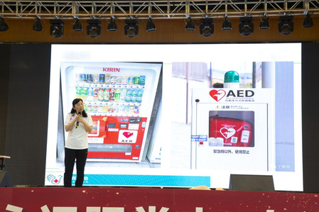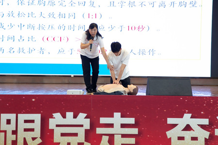 讲座伊始,王梅教授生动地讲解“心肺复苏术”的同时,邀请员工上台演示“心肺复苏术”的三个核心步骤:评估及确认现场安全、胸外按压、人工呼吸。接着,她通过操作人物模型,进一步讲解了核心步骤的注意事项,如胸外按压的频次、深度和具体部位。其间,员工们踊跃上台进行练习,将现场的气氛推向高潮。最后,王梅教授详细地讲解了AED的使用方法,并强调同学们碰到突发情况时,可以在地图中获取最近的AED位置,从而为急救争取时间,提高急救效率。