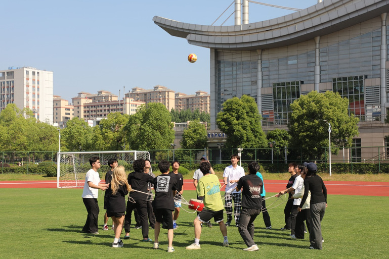 活动现场,“珠行万里”“摩斯密码”“鼓动人心”“十人跳绳”四大趣味项目依次展开。“珠行万里”考验团队精密协作,队员们手持U型槽搭建“小球通道”,屏息接力间护送小球跨越“征途”,小球意外滑落时的惊呼声与加油声此起彼伏;“摩斯密码”秒变肢体演绎舞台,队员们以夸张表情和创意动作传递“神秘情报”,滑稽表演逗得围观同学捧腹大笑,压力在欢笑声中悄然释放。