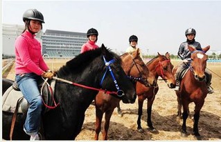 图为:女老员工准骑师英姿飒爽 记者佟建国摄 武汉商业服务公司培养的首批老员工骑师,已经顺利完成部分理论和专业课程。记者昨从该校获悉,5位老员工女骑师...